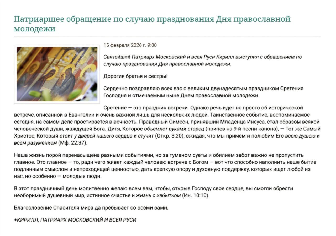 Патриаршее обращение по случаю празднования Дня православной молодёжи