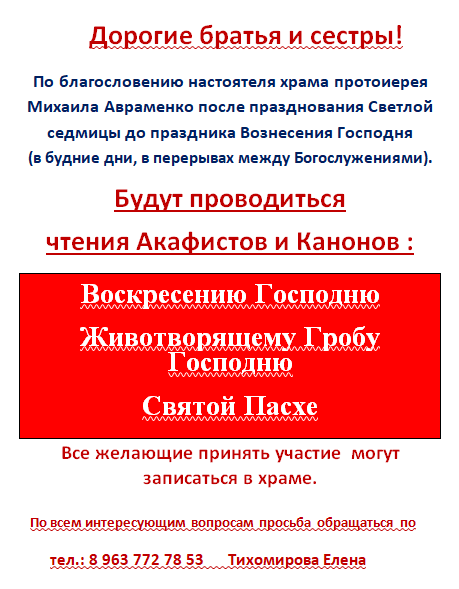 Чтения Акафистов и Канонов : Воскресению Господню, Животворящему Гробу Господню, Святой Пасхе