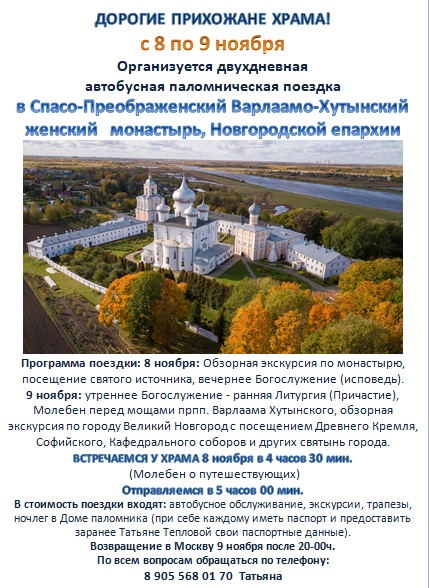 8-9 ноября 2025 года пал поездка в Варлаамо-Хутынский жен монастырь Опубликовано в 09.10.2025 pohvala2012 Поделиться:TelegramВКонтактеОдноклассникиGoogleTwitter