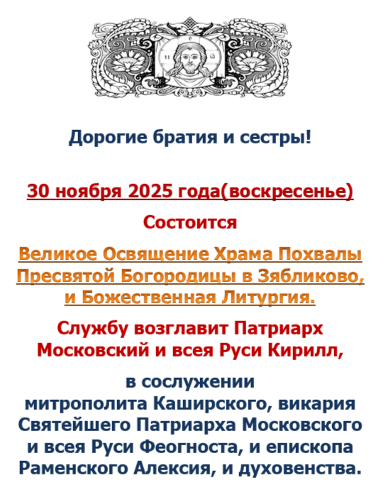 30 ноября 2025 года(воскресенье) — Великое Освящение Храма Опубликовано в 28.11.2025 pohvala2012 Поделиться:TelegramВКонтактеОдноклассникиGoogleTwitter