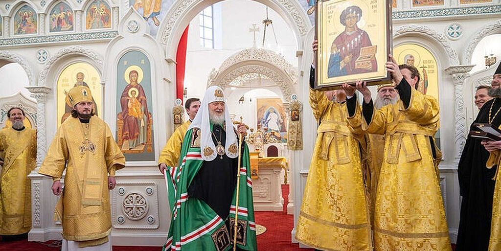 Патриарх Кирилл подарил приходу большую икону великомученика и целителя Пантелеимона со словами,