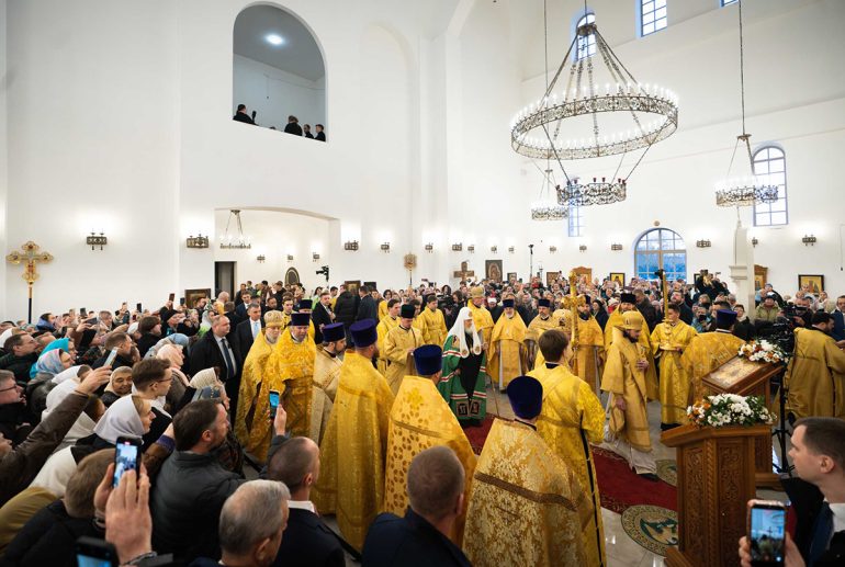 К моменту встречи Святейшего Патриарха храм вместимостью 600 человек был заполнен полностью.Те, которые не смогли вместиться, ожидали на улице около храма и создалось впечатление, что людей собралось не меньше тысячи человек. Службу возглавил Святейший Патриарх Кирилл в сослужении митрополита Каширского Феогноста, викария Святейшего Патриарха Московского и всея Руси, епископа Раменского Алексия, личного секретаря Патриарха и духовенства.