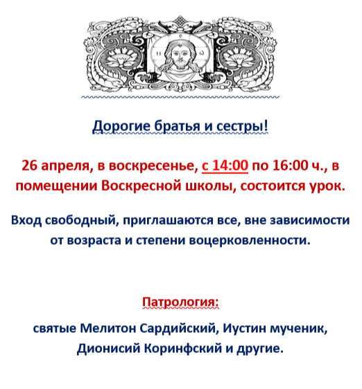 Занятие в Воскресной школе в воскресенье, 26.04.26г., в 14:00 Опубликовано в 22.04.2026 pohvala2012 Поделиться:TelegramВКонтактеОдноклассникиGoogleTwitter